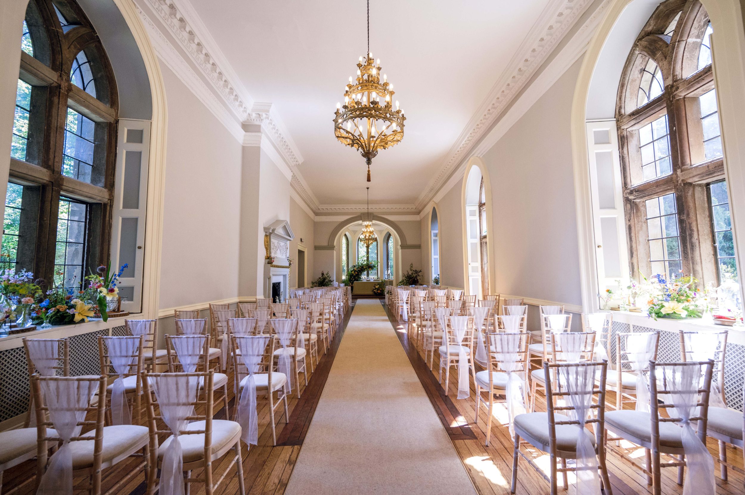 The spectacular Ballroom is licensed for civil ceremonies and has a 75ft aisle and leaded glass windows, offering a unique and tranquil setting usually only found in Churches. The Ballroom can also seat up to 150 people for the wedding breakfast and the elegant reception rooms and the vaulted cellar can easily accommodate 250 guests for the evening celebrations.